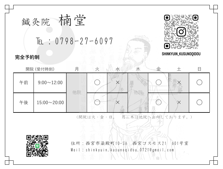 西宮市染殿町10-36 西宮コスモス21 601号 「鍼灸院 楠堂」