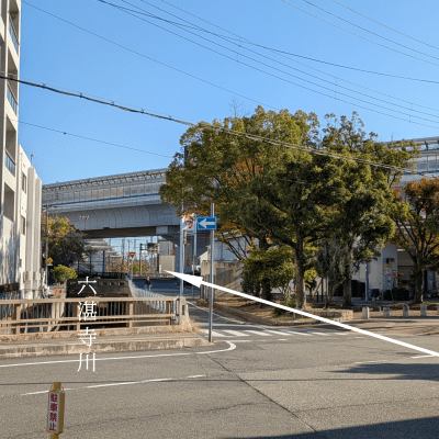 ② 駅を南側に出ての六湛寺川(ろくたんじがわ)に沿って南へ向かって下さい。