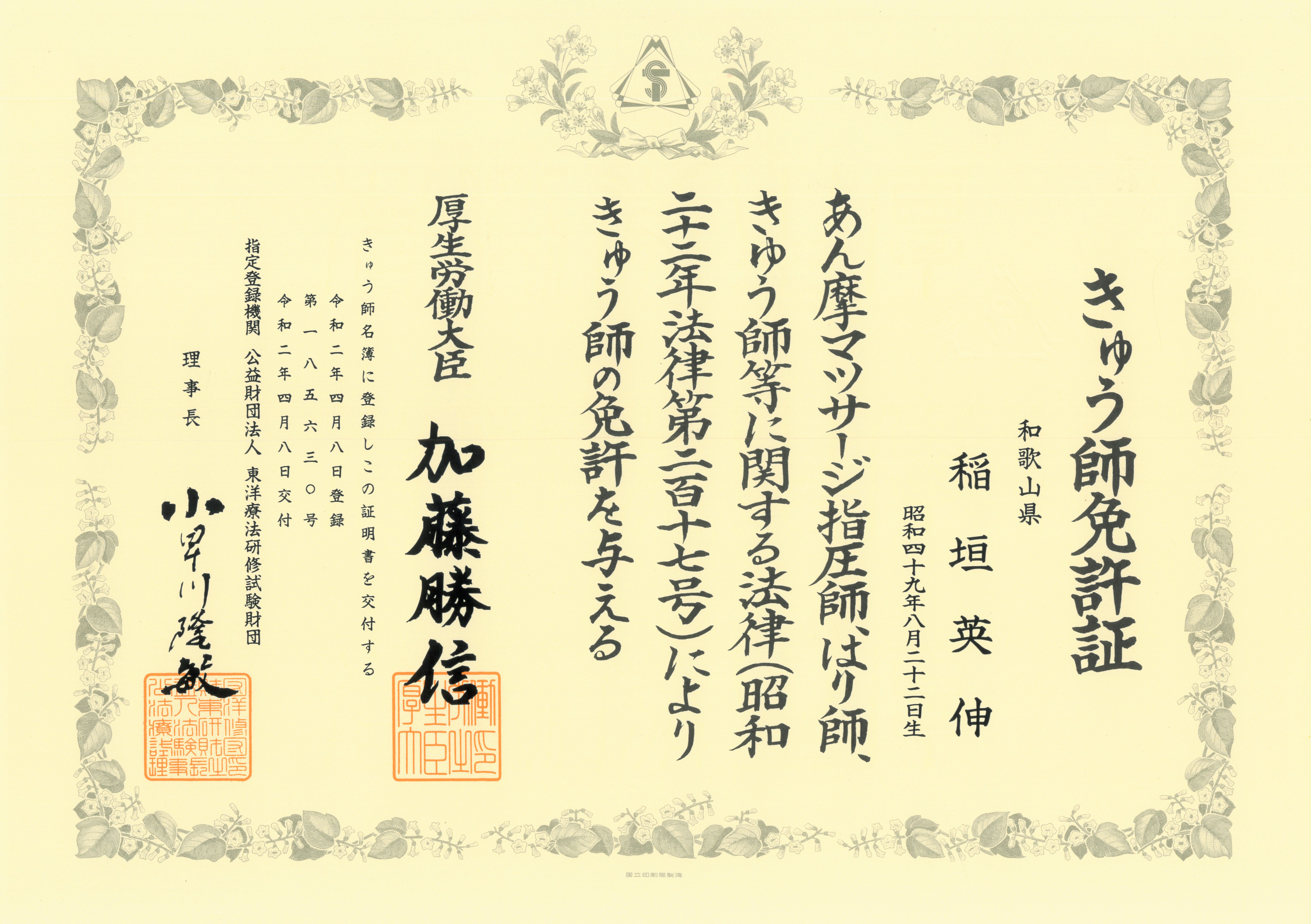 ・平成医療学園専門学校(鍼灸師科)を卒業、鍼灸師の資格を得る。